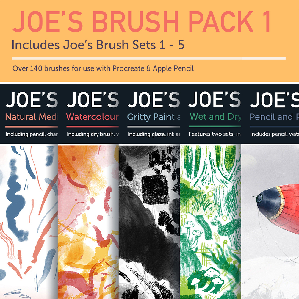 My Brush Pack 1 contains Joe's Brush Set's 1 - 5, adding up to to over 140 brushes for Procreate!